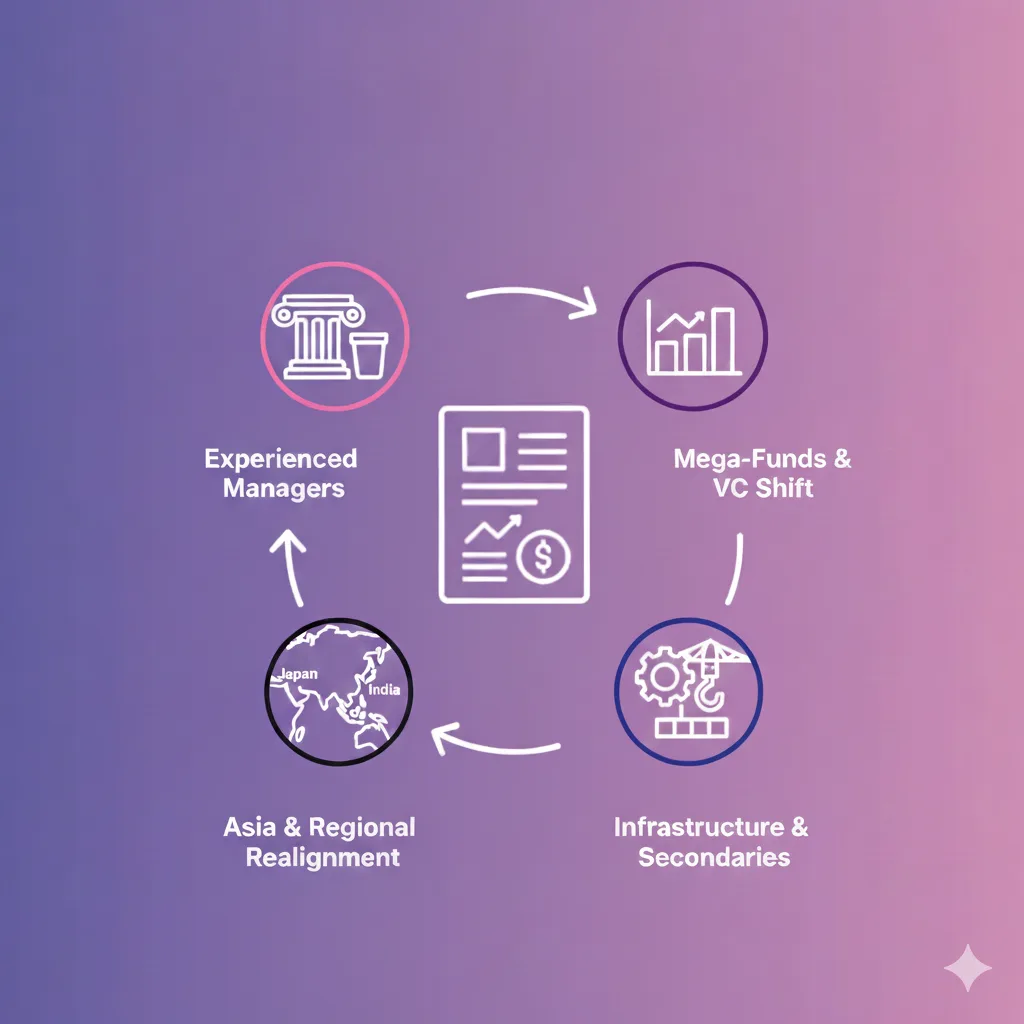 The market has bifurcated into a “barbell” structure. Capital is concentrated either in massive global mega-funds or highly specialized niche strategies.